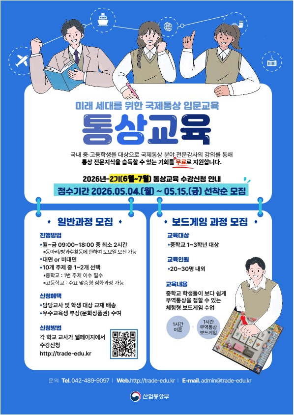 미래의 글로벌 통상 리더를 양성하는 '2026년 제2기 중·고등학생 대상 통상교육 정규과정' 모집을 다음과 같이 실시합니다.